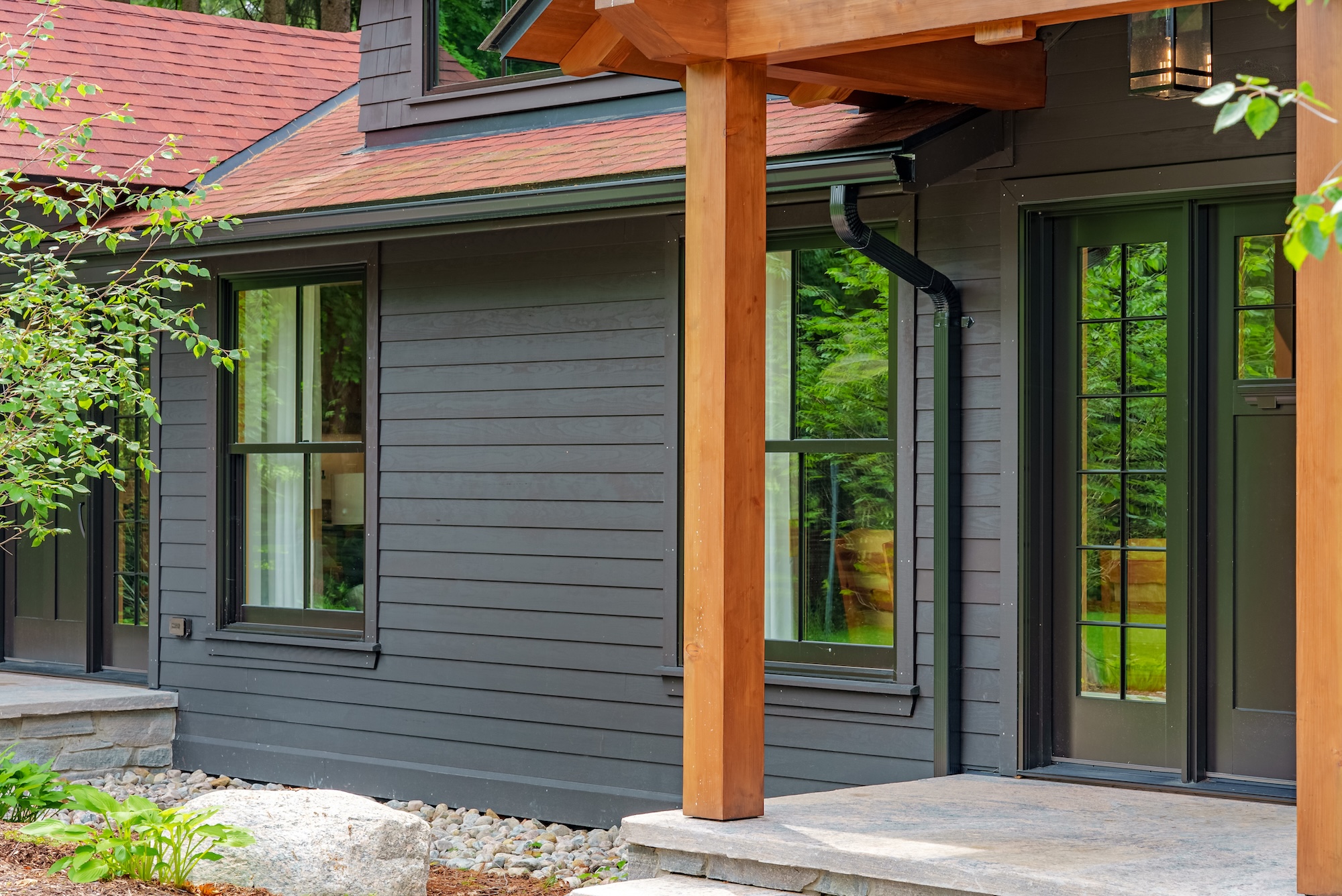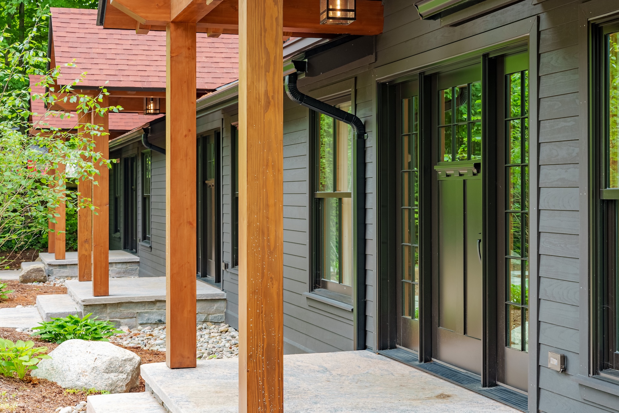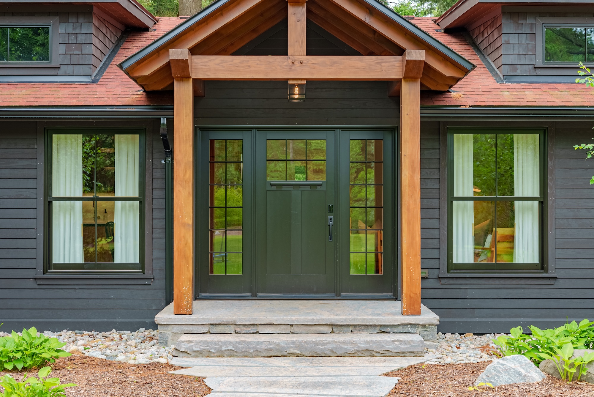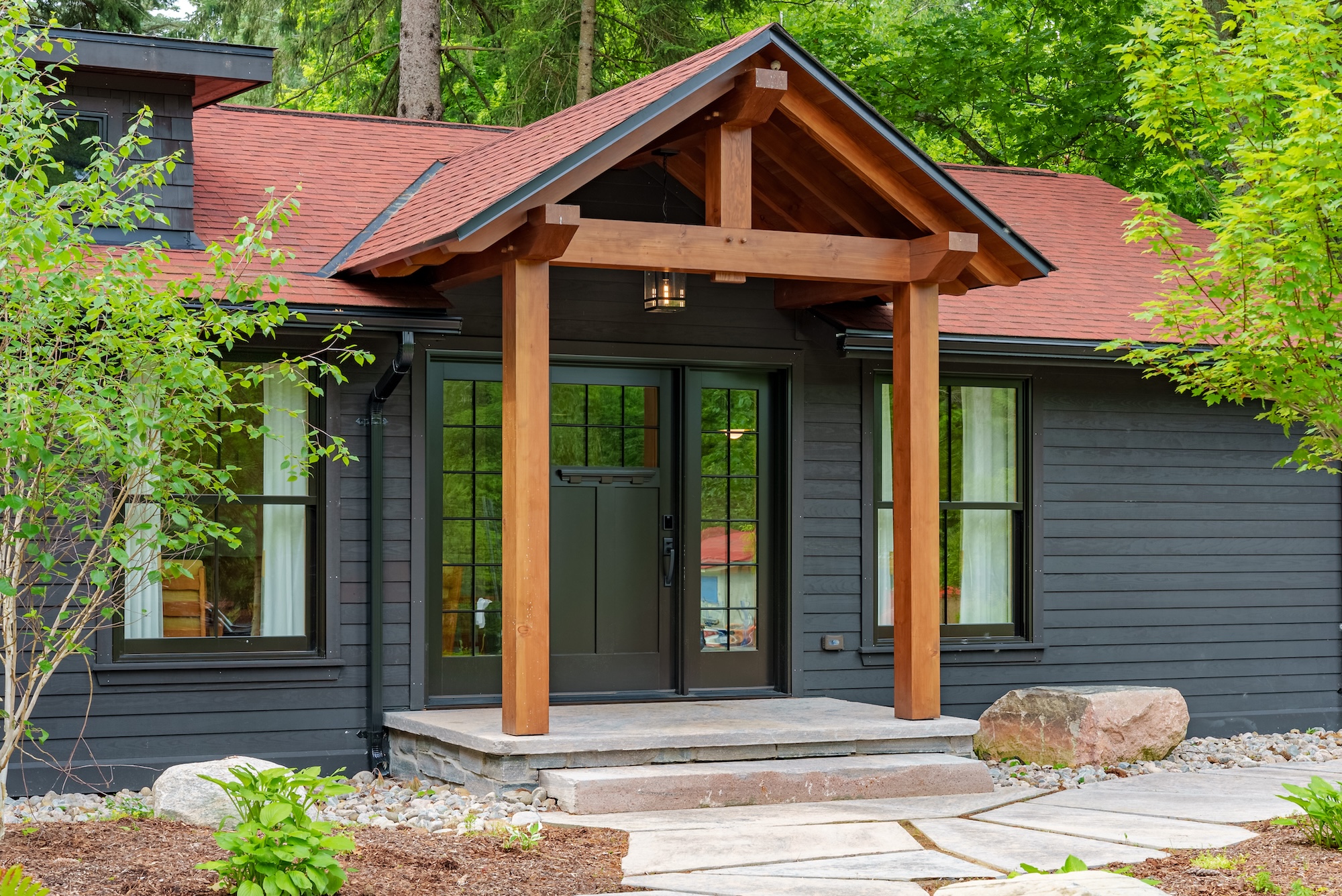 This thoughtfully designed exterior blends modern cottage architecture with timeless craftsmanship. Warm wood accents, clean lines, and a low-profile roofline create a welcoming presence that sits naturally within its surroundings, offering a perfect balance of visual impact and connection to nature.